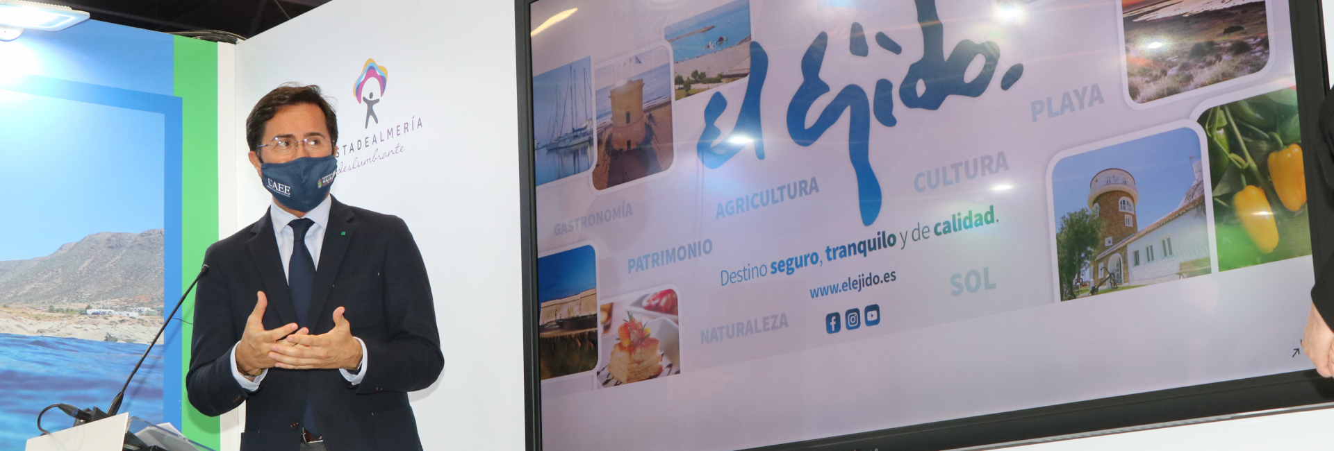 El Ejido, 19 de mayo 2021.- El Ejido se ha presentado hoy en FITUR 2021 mostrándose como un ‘Destino Seguro, Tranquilo y de Calidad, además de atractivo y apetecible, a través de su excelente e innovadora oferta turística complementaria y gastronómica, durante el acto celebrado en el stand de la Diputación de Almería ‘Costa de Almería’ en el IFEMA de Madrid.