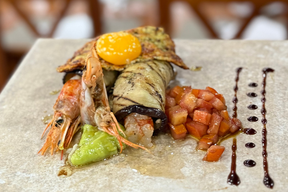 Crujiente de gamba y pimientos confitados.
