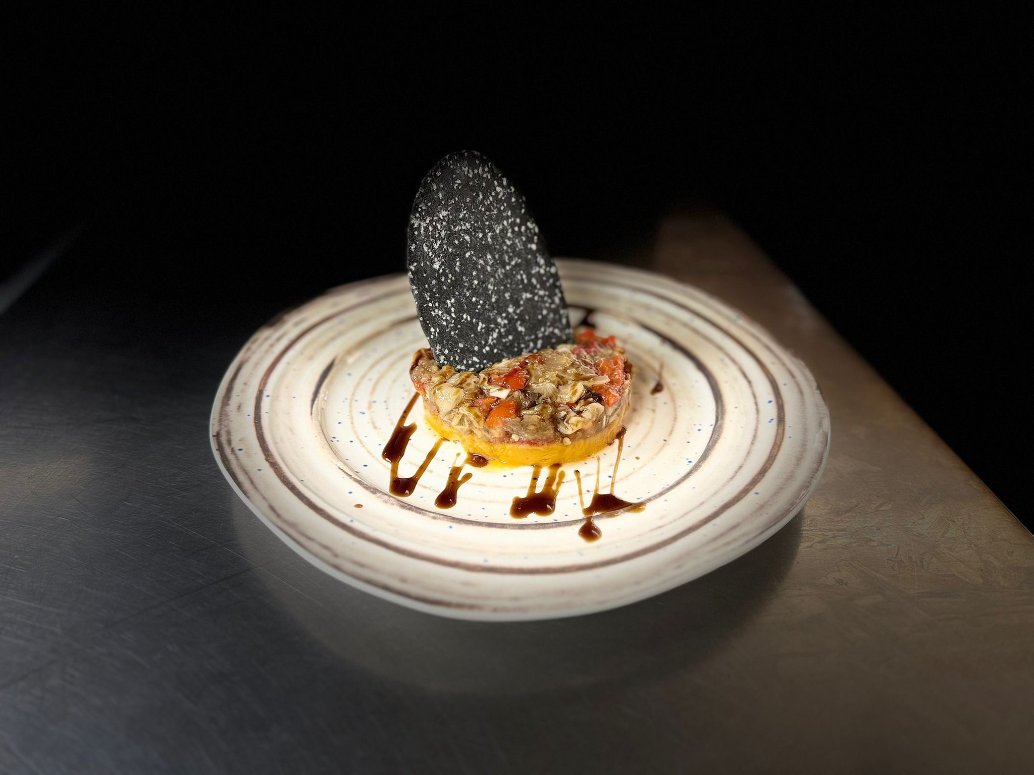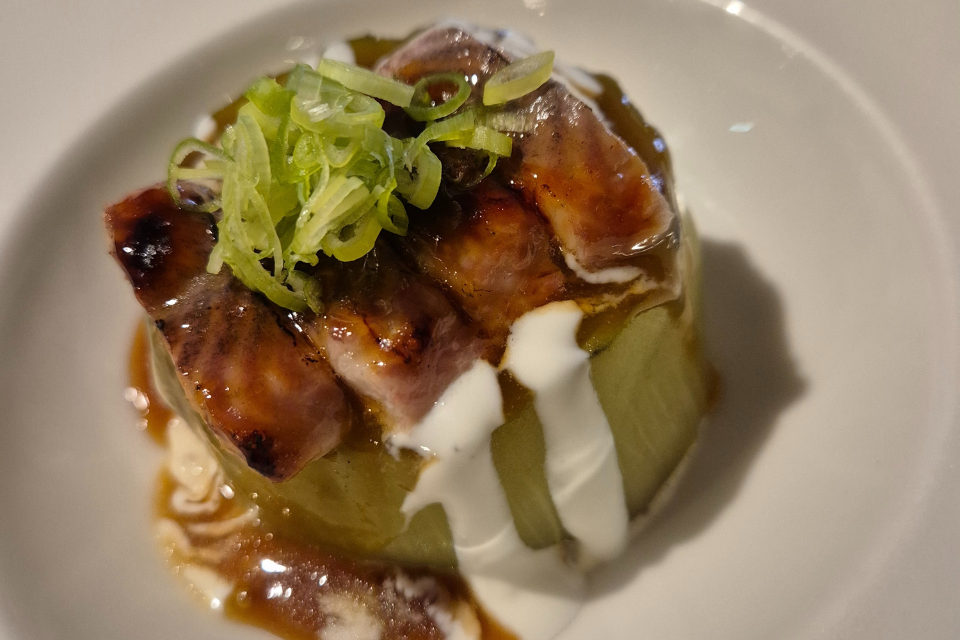 Berenjena confitada, miso cerveza y anguila ahumada.