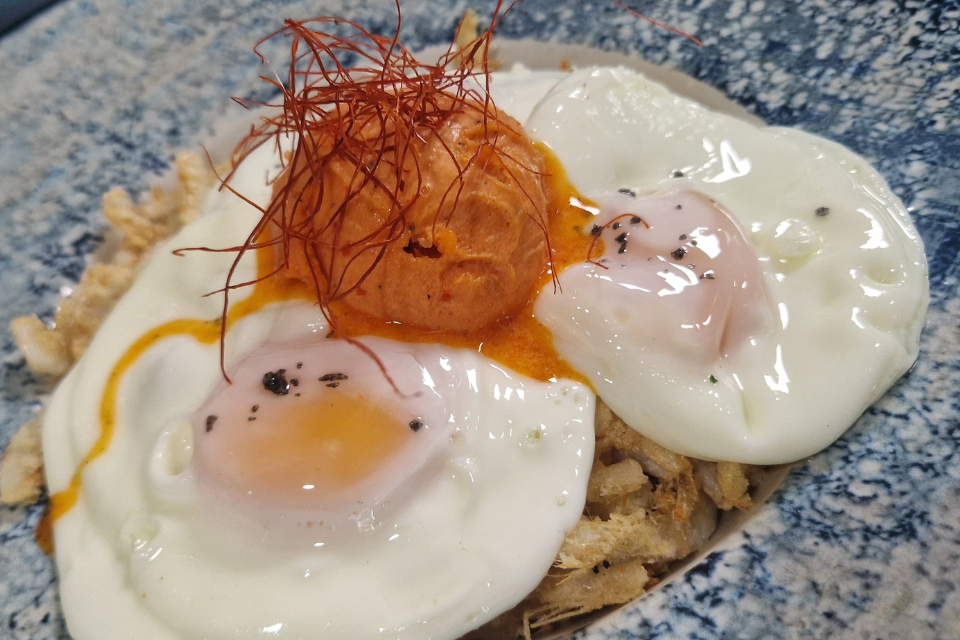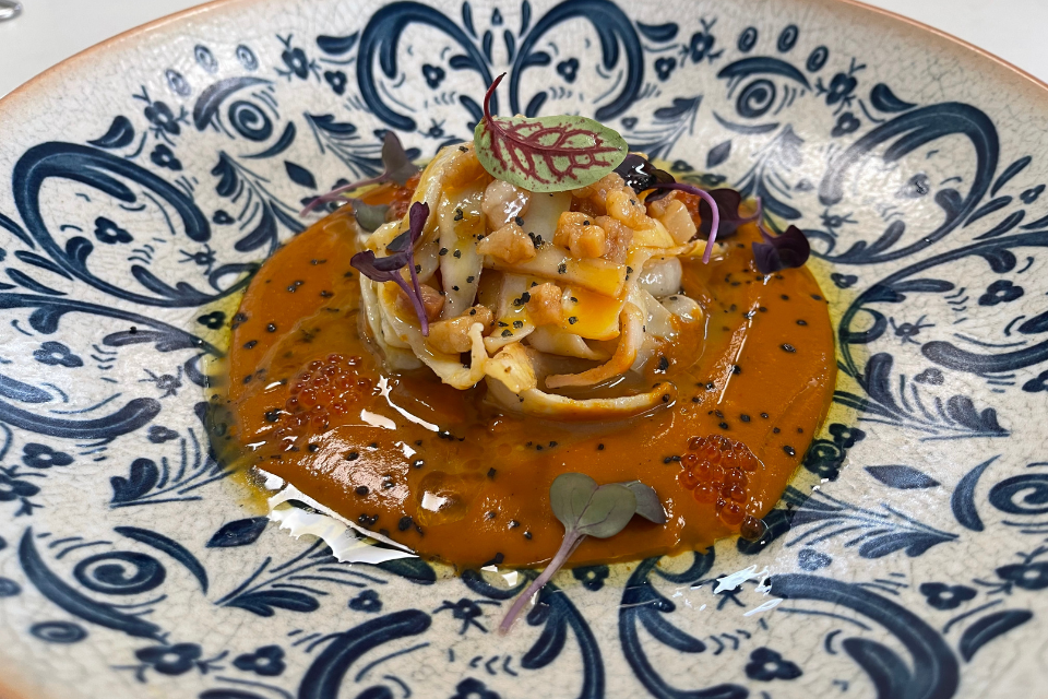 Tallarín de calamar a la carbonara con pimiento sweet palermo asado.