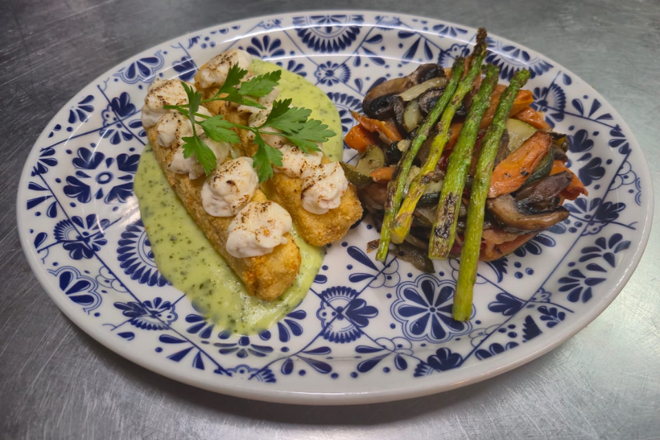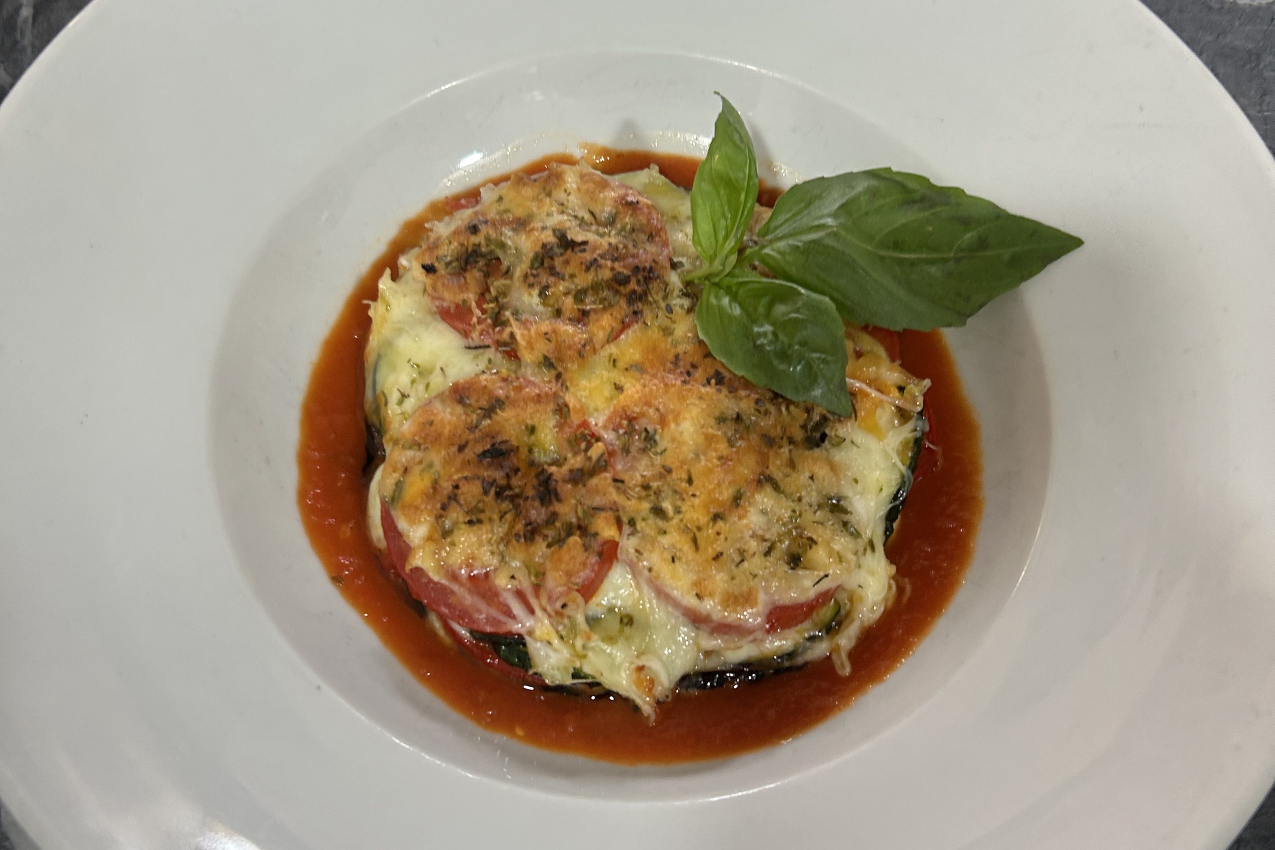 Berenjena a la norteña con teja de calabacín y manchego.