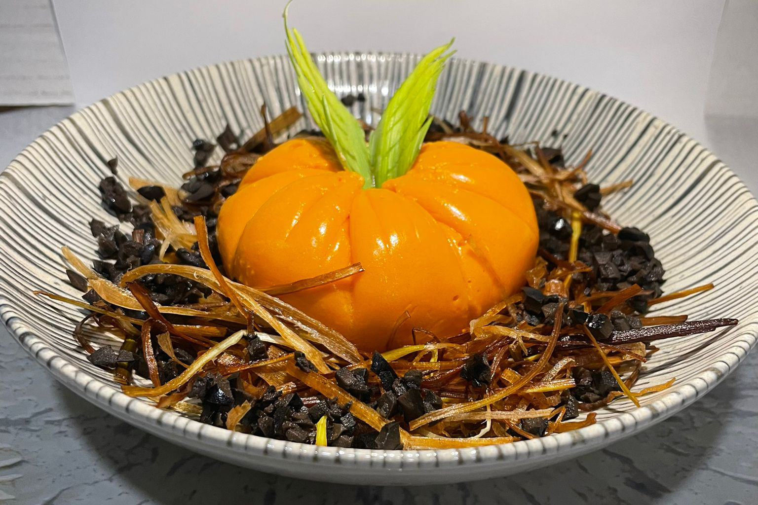 Mousse de berenjena con praliné de almendra, toffee y aire de canela.